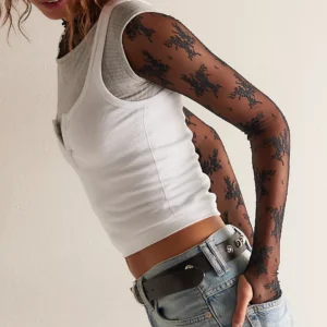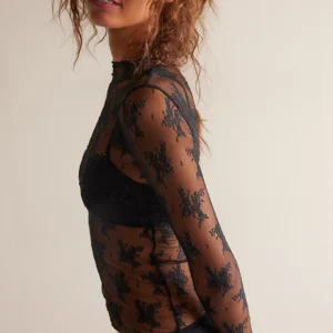 Perfect for layering, this sultry mesh long-sleeve is featured in a sheer design with floral embroidery, a high-neckline and thumbhole details.
