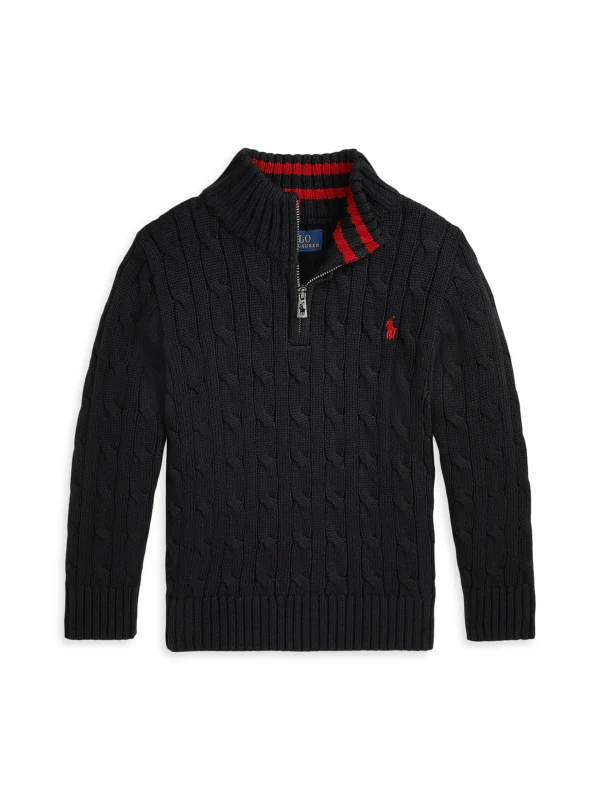 This Polo Ralph Lauren half-zip pullover sweater is crafted of cotton and features a classic cable-knit stitch. The label’s signature pony is embroidered on the chest.